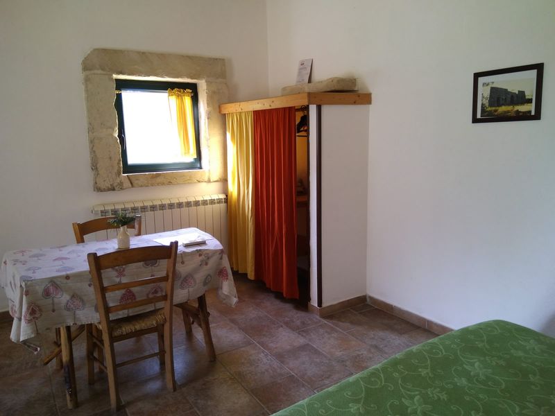 Casetta monolocale dell’Asinella, monolocale con veranda situato nel frutteto – uliveto, 28 – 33 mq, arredamento rustico, letto matrimoniale, mass. 4 posti letto, tavolo e sedie, angolo cottura in vano separato, bagno moderno con doccia, termosifoni, veranda sotto grande porticato o tettoia.