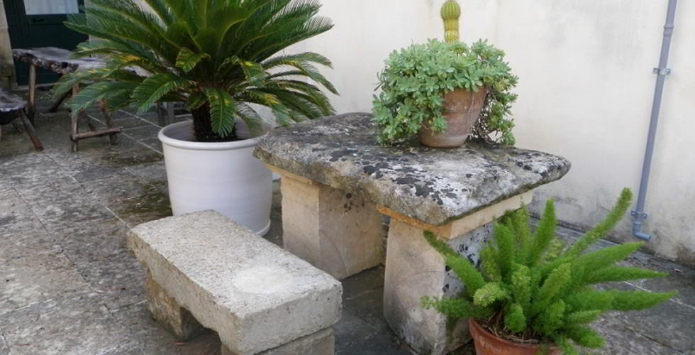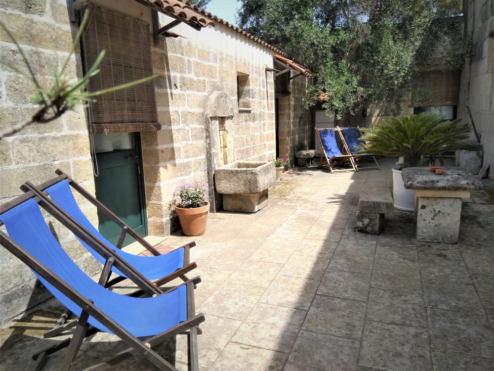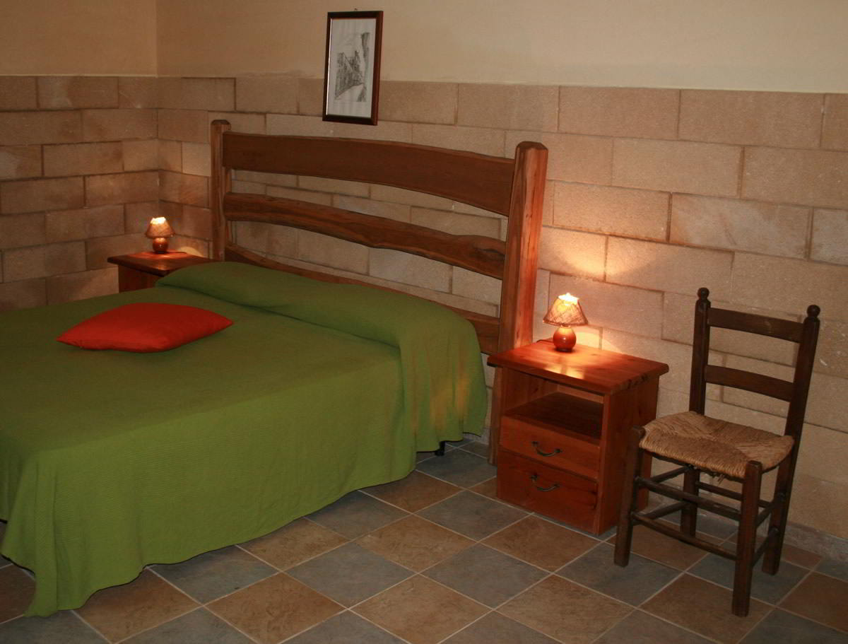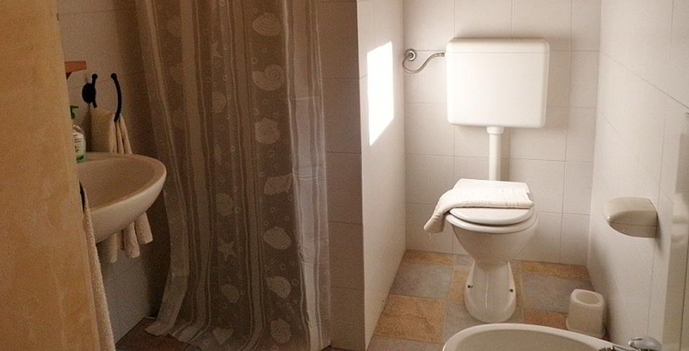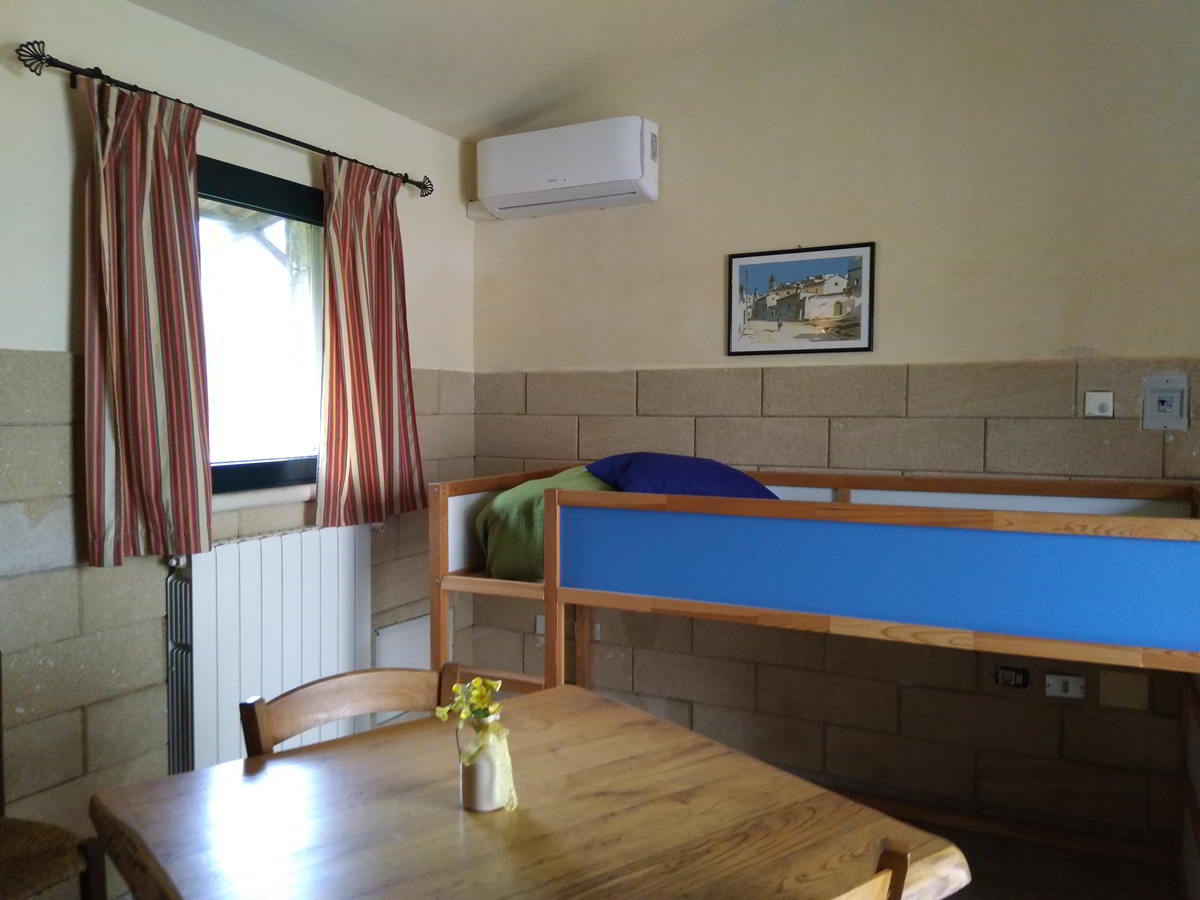 Room for 2 to 3 people (18 sqm) with double bed and single bed, rustic furniture, air conditioning. Bathroom with shower, wc and sink and bidet. Situated at the inner courtyard, loungers.