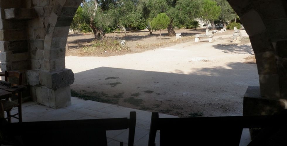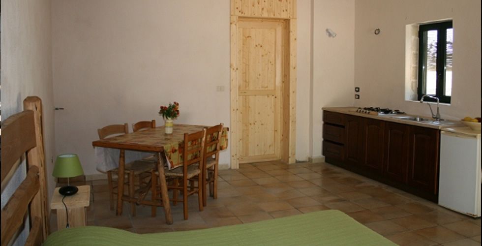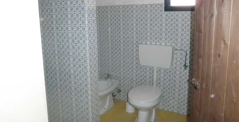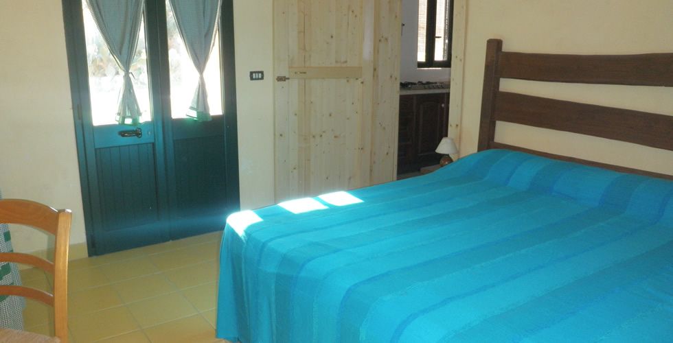 Two-room house, 48 sqm, with little matrimonial room with access to the bathroom (sink, shower, bidet, wc) and a little covered veranda. Very spacious living room with kitchen area (fully equipped, 5 fires, fridge, etc.), table, chairs, 2 single beds. Bathroom with shower, sink, wc and bidet. Fan in every room, heating. Covered veranda under arcade with table, benches, loungers, integrated barbecue.