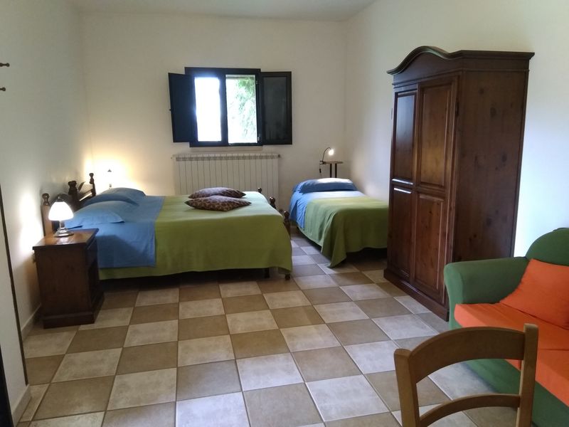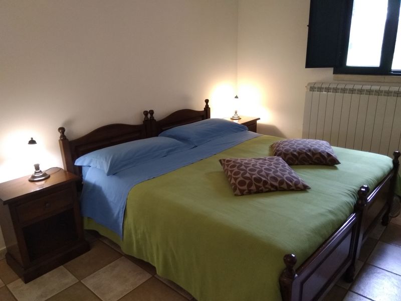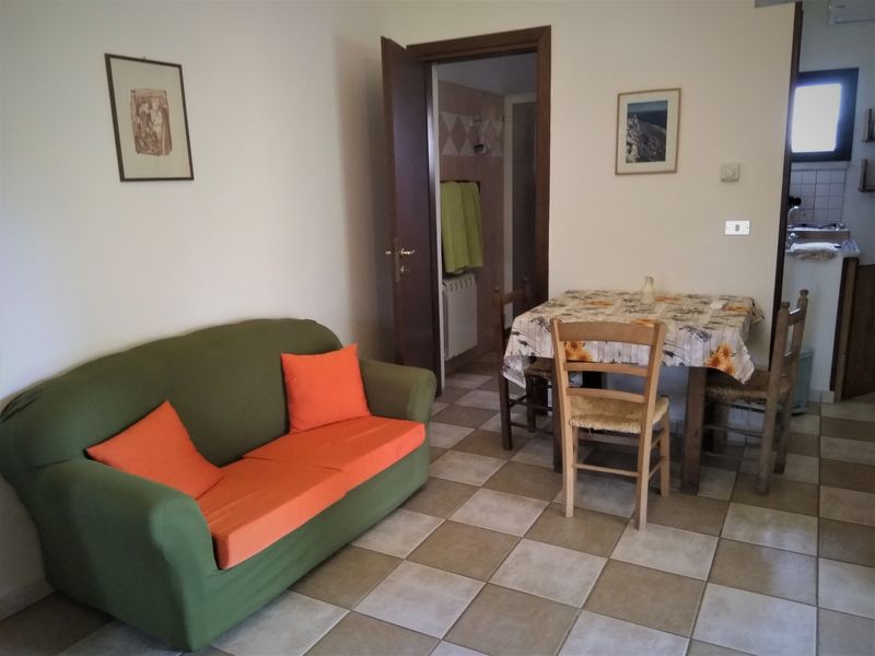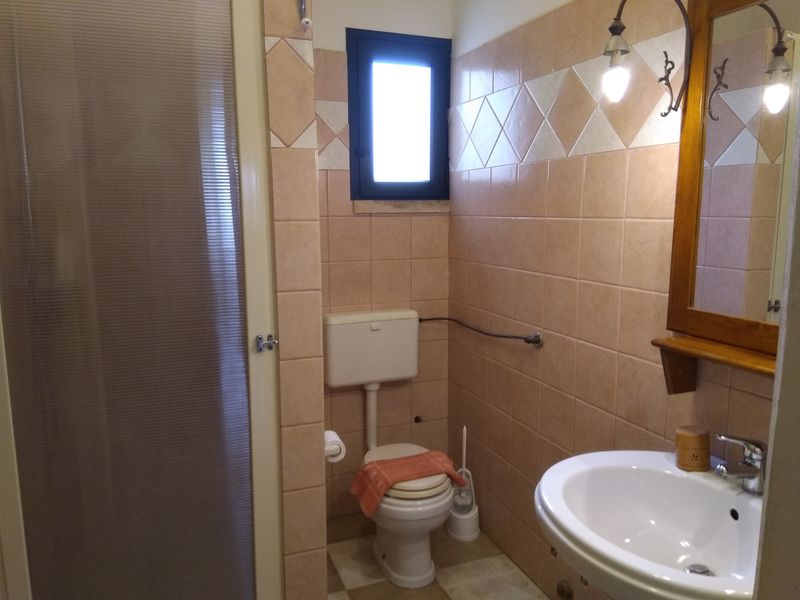 One-room-house (30 sqm), double bed and single bed, furniture “arte povera”, separate kitchen corner. Air conditioning.. Bathroom with shower, sink, wc. Private covered veranda under arcade with table, benches, loungers.